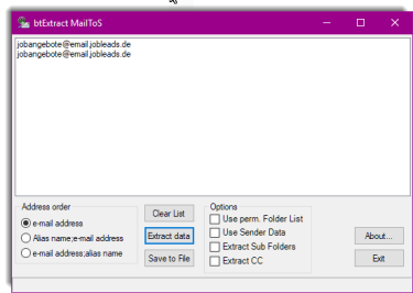 The application btExtract MailToS extracts all e-mail addresses from the application MS Outlook. All e-mails can be used as a source pool and can be located on any place.